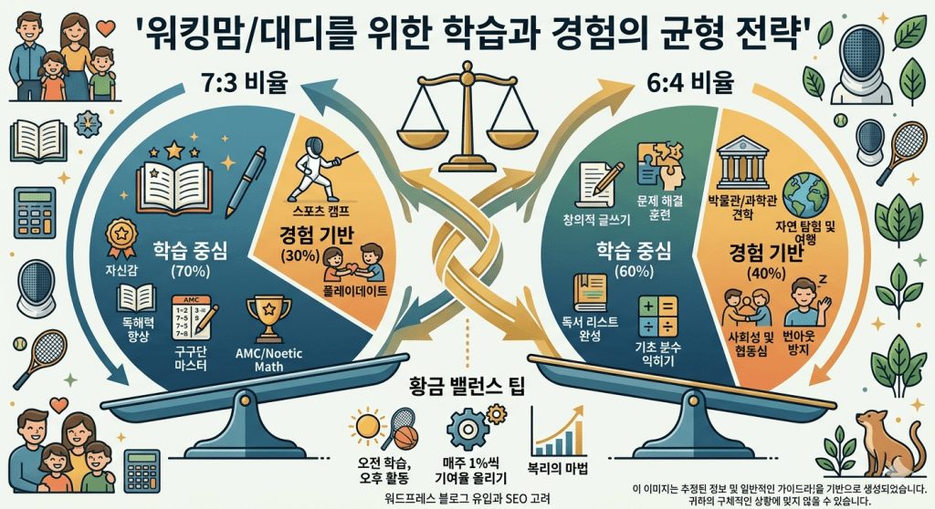 워킹맘/대디를 위해 학습과 경험을 7:3 또는 6:4 비율로 섞는 전략을 추천합니다.