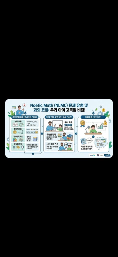 미국 초등학생들 사이에서 인기 있는 수학 경시대회인 Noetic Learning Math Contest(NLMC) 시즌이 다가오면 많은 학부모님이 고민하십니다. “과외를 시켜야 할까? 아이 혼자서도 잘할 수 있을까?” 오늘은 Noetic Math의 특징과 과외의 효과, 그리고 자주 출제되는 문제 유형을 자세히 알아보겠습니다.